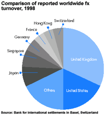 No mercado mais competitivo do mundo, ao lado podemos conferir uma estatística dimensional da participação dos principais centros financeiros do mundo. O Maior volume de negociações (32%) fica por conta do Reino Unido, apesar de sua moeda a “Libra Inglesa” não ocupar posição de destaque principal com relação às transações envolvendo paridades onde ela faz composição. Os EUA ocupam apenas 18% do mercado e o Japão vem em terceiro lugar ocupando 8% do volume total.